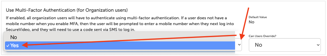 • If this setting is set to "Yes", then any licensed user in this organization can enable this option for themselves; see section, Enable Multi-Factor Authentication (for an individual user).