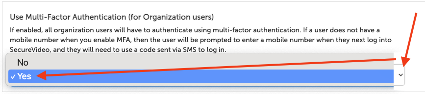 • If "Yes" is selected, then all organization users with a mobile number in their profile will be prompted to enter a code sent by SMS when they log into their account (see section, Logging in with Multi-Factor Authentication). Users without a mobile number will be prompted to enter one upon their next log in, and then enter the code sent by SMS.