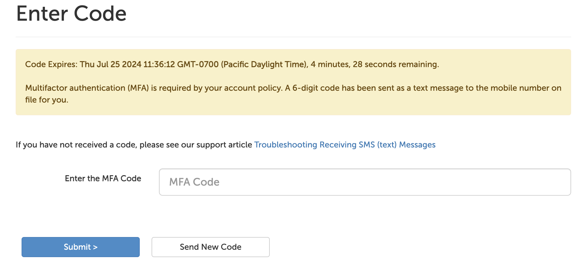 If RBA has been triggered, the code input page will load and the user will be sent a code via text message to the number on file.